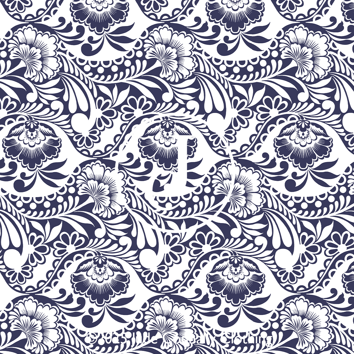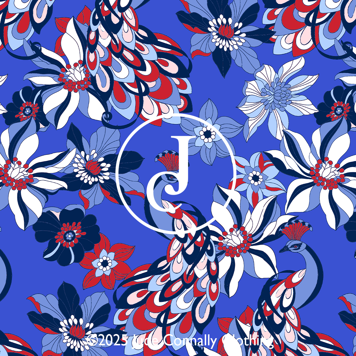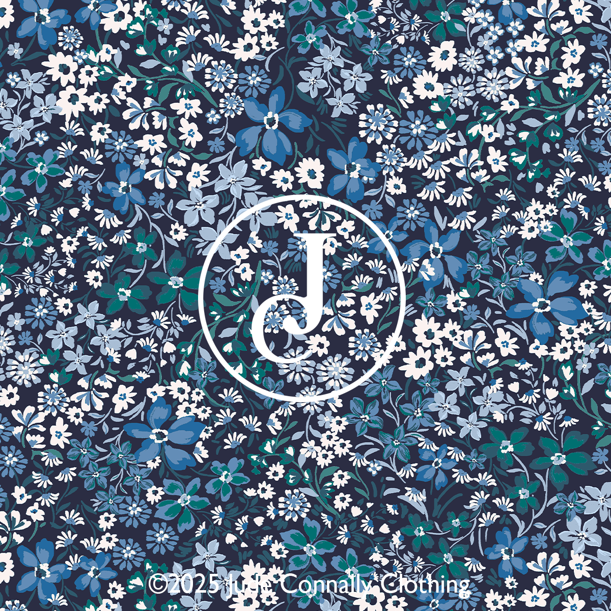 and modern layered look. Bold floral patterns in navy, accented with bright